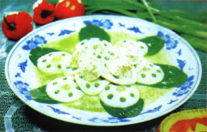 1.鱼肉、肥膘内剁成泥,放在碗内,加入精盐4克、葱姜汁、绍酒和清水50克,搅拌上劲,再加鸡蛋清、味精和绿菜汁拌匀成馅。