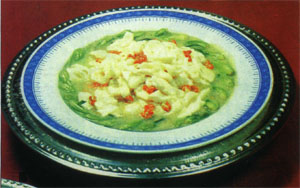 4.取鱼肉馅1份,放在鱼肚上,蟹腿、蟹黄放在馅上,在菱形的左右两个尖端上,各撒1小撮香菜末,再轻轻地按一下。如此将鱼肚块逐一做好装盘,上龙用旺火蒸5分钟左右取出。