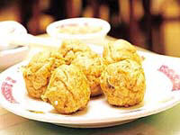 (2)、加盐、蛋清、酒、味精、牛奶、淀粉,用力搅打至鱼茸成团,用手挤成丸子,在芝麻里滚1周,于温热猪油中炸至金黄色。佐膳服食。