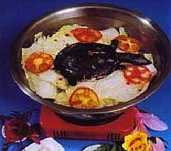 (3)大白菜,冬瓜,白萝卜切成5厘米长,5毫米厚的片,装入火锅盆,加姜葱丝,味精,红枣,枸杞子,鸡精,胡椒粉,料酒掺白开水,放甲鱼,淋上精制油上台即可。