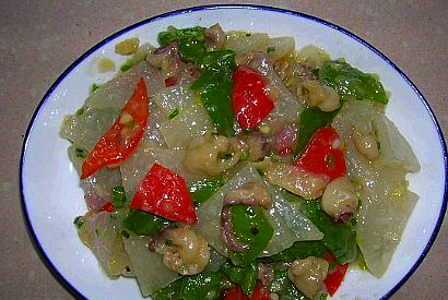 主料:白萝卜半斤,红甜椒一两,绿菜椒一两全部切块,鱿鱼二两片成薄片,葱,姜切末,盐,味精适量,淀粉一大匙加水调成芡汁。