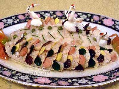 2、冬笋丝加盐、料酒、味精、白糖入味,各丝分置碗底,余料填入碗中,然后扣入盘中,淋上味汁即成。