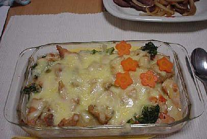 往烤盘子里放入准备好的菜料,浇好酱汁儿;再放一些拉丝奶酪,入200度的烤箱烤7~8分,出炉.