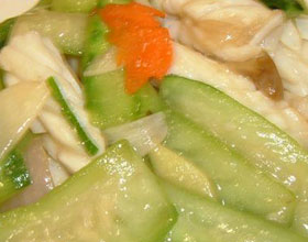 3.锅内放油烧七成热时将鱿鱼拌上适量盐和干淀粉,下入油锅爆一下,倒入漏勺中沥油(即滚龙身形),锅内留油50克,下入红辣椒加炒入味,再下入丝瓜炒一下,随即倒入鱿鱼卷,冲下兑汁,颠炒几下,装入盘内即可。