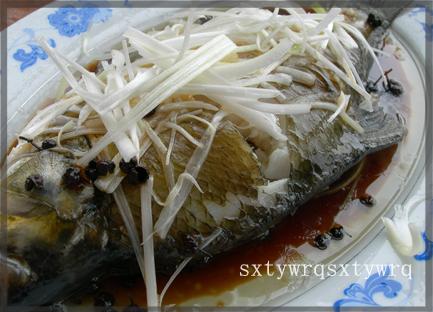 2、鱼身上放切好的葱丝,浇烧热的花椒油;