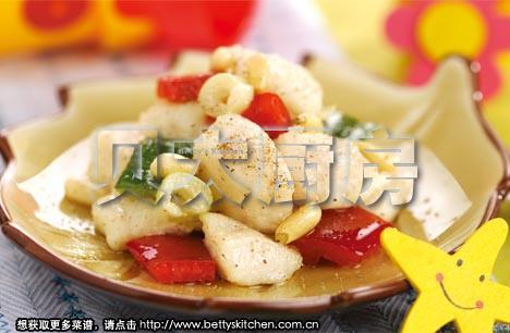 1. 鲈鱼切成2厘米的小丁,用蛋清,白胡椒粉,水淀粉和少许油,混合拌匀