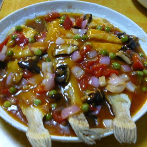 锅里留底油适量,依次放入洋葱,香菇和西红柿,翻炒几下,加入番茄酱3大匙,糖1匙,醋2匙,盐适量,香油半小匙,再加入青豆,煮滚,然后淀粉勾芡,浇在鱼上即可。