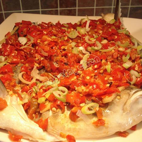 5.在鱼头上层盖满炒制过的剁椒姜末。