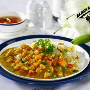 锅烧热,放入黄油,黄油化后放入阿拉斯加三文鱼轻轻翻炒,然后放入洋葱、青、红辣椒,加入盐、咖喱、淀粉炒成浓稠状,出锅浇在炒饭上,撒上香菜碎即可。