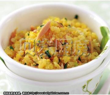 3、将压好的土豆泥、切好的青菜碎及金枪鱼肉混合拌匀,然后将蛋黄碾碎撒在上面即可。