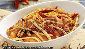 大火加热炒锅中的油,把干辣椒入油中迅速拨炸呈熟色。将腌好的肉丝入锅煸炒,表面变色后加鱼腥草小段。
