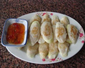4、平底镬下油,把酿好的胶笋排列放好(鱼青朝下),用慢火煎至金黄色即可上碟。