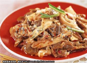 3.将泡辣椒片、冬菇片、笋片放入油锅内炒几下,同时放入肚尖、鸡胗。