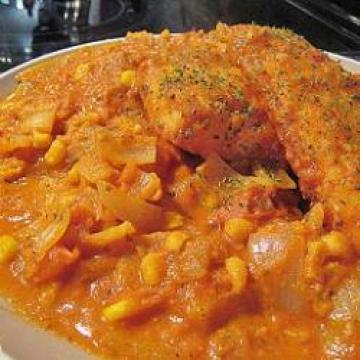 3.快火下油起锅,用少许盐爆香洋葱至软,再加入蕃茄炒香,然后加入汁料煮透, 调好味,熄火,加奶酪炒匀,淋上鱼块即成。