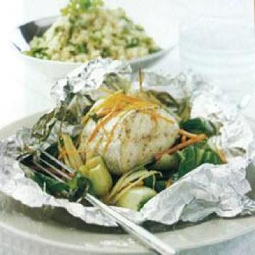 4.用叉子搅松煮熟的布格麦食,然后拌入橄榄油、柠檬汁、大蒜、罗勒、香菜和葱。用盐和胡椒调味。上桌时,每人一块纸包鱼(吃的时候才打开)和一碗布格麦食。