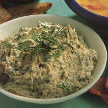 细香葱1小把,莳萝1小把,荷兰芹1小把,罐装鲑鱼(三文鱼)415克,奶油乳酪150克,柠檬1个,塔巴斯科辣酱1茶匙,盐、黑胡椒各少许,配菜:,黑面包、条形或三角,形吐司、梅尔巴或饼干