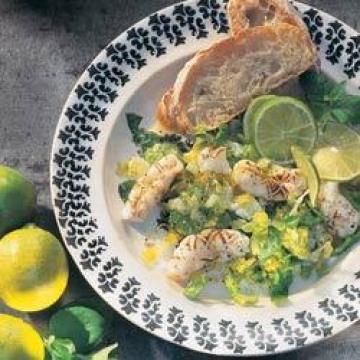 经预先处理的鱿鱼(去头和触须)500克,小叶莴苣(littlegemlettuce)3棵,冬葱2颗,莱姆(青柠)2个,薄荷6小枝,黄油85克,大蒜2瓣,食用油2汤匙,盐、黑胡椒适量,配菜:,法国或意大利面包适量