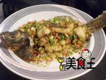 鲈鱼一尾,花椒10粒,干辣椒10公克,葱段1支,地瓜粉60公克,a.葱姜水1/2杯,b.酸甜糖醋汁1/2杯