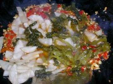 材料:韩国泡菜1大包,鲑鱼头1付,韭菜200克,洋葱半颗
