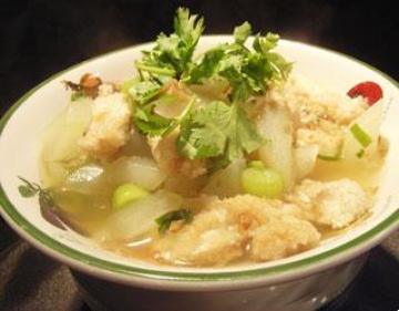 (4)先把姜片爆香,放入青蒜、辣椒拌炒,加米酒、鲨鱼,再倒入高汤。煮开后加少许味精,焖一下即可。
