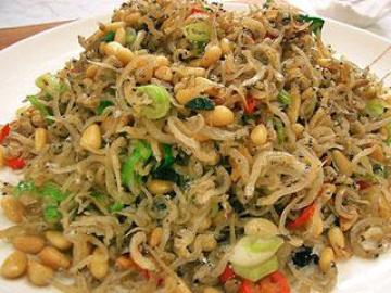 材料:仔鱼300克,松子150克,蒜头2瓣,辣椒1根,葱1根,调味料:绍兴酒1大匙