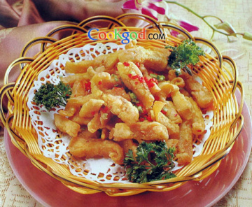 2.鱼翅拍粉,入六至八成热油中炸熟后捞起。