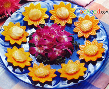 1、南瓜切厚片,刻成葵花形,加调料调味,入笼蒸透。