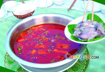 2、锅中下色拉油,烧至六成热时依次下入糍粑辣椒、泡辣椒、泡姜、花椒小火煸炒5分钟,出香出色后加入鲜汤大火煮沸,下入鸭血片、酸菜片、火腿肠、豆芽中火煮1分钟,取出一起装入盆中,鱼片随盆上桌。当着顾客的面儿将鱼片下入盆中静置1分钟,捞出鱼片后即可食用。