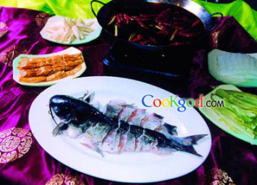 5、将香料锅(锅下点燃酒精炉)、鱼和片笋一起上桌,食前将鱼肉、笋放入香料锅中涮熟即可。除了放鱼和笋涮制外,也可以涮制其他蔬菜和肉类。