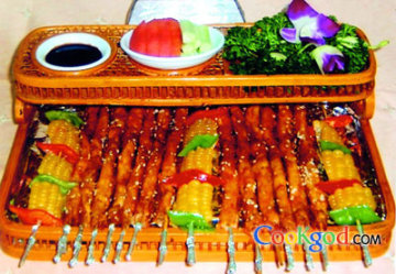 2、锅置火上加色拉油烧至七成热,将鱼串放入四成热油中小火炸1分半钟至外酥内嫩,再将玉米串放入六成热的油中小火炸30秒至青、红椒块断生。分别用锡纸将竹签把包好,撒上辣椒面及芝麻,摆入筐内。