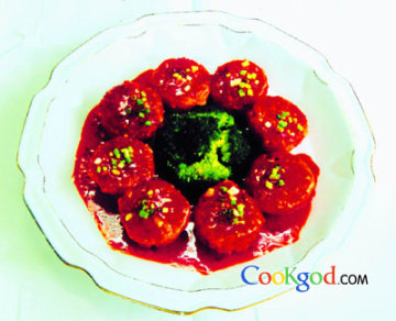 (2)用黄油先将蒜头煸香,再加入各式蔬菜、混合香料、葡萄干一起翻炒,加盐、胡椒调味;另取蒜头切片,用黄油加干葱炒香后,倒入番茄汁,加盐等调味即成蒜香番茄汁。