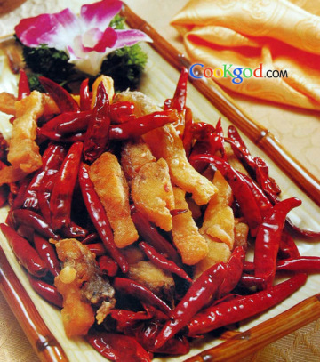 3.炒香辣椒、花椒,放鱼条炒匀即可。