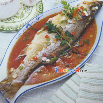 3、将鲈鱼摆在盘内,加葱、姜、料酒上笼蒸8分钟备用;炒锅注油烧热,放入葱、姜、蒜粒、青红椒和高汤烧沸,撇去浮沫,加白糖、味精、精盐、酱油、淀粉勾芡收汁,淋在鲈鱼上即成。