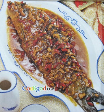 3、锅注油烧至七成热,下入鲤鱼炸挺;倒出锅内余油,下入肉末、干辣椒、冬菜、葱姜蒜末炒香,烹料酒,加汤、生抽、糖、鲤鱼、用慢火烧透,将鱼铲出装盘内。