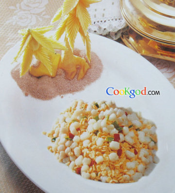 2、锅内放油烧至六成热,分别将玉米片和鱼丁放入,炸至酥脆,捞出。锅内余油倒出,留油少许,放入青红椒丁炒断生,再倒入鱼丁、玉米片炒匀,簸转,起锅,盛入条盘一端,另一端点缀装饰物,边放上椒盐即成。