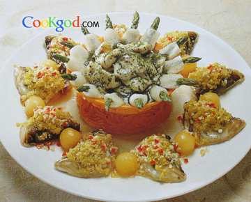 3、鱼唇上笼蒸至七成熟,加入调好的剁椒,与上述原料一同装盘,摆成造型即成。