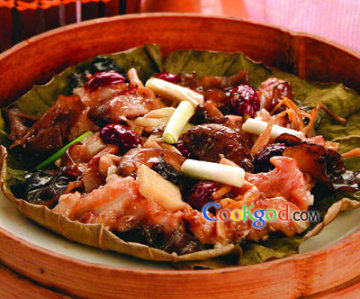 3、将荷叶铺在笼屉内,将鳄鱼腩与红枣、金针、云耳、姜片、蒜蓉调匀,放在荷叶上,上笼大火蒸8分钟,取出撒葱段上桌即可。
