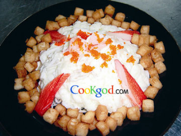 3、锅内放入色拉油,烧至七成热时放入面包块小火浸炸3分钟,取出控油;锅洗净,烧干后放入牛奶、2克盐、糖、生粉、200克蛋清小火搅5分钟至表面凝结,放入白饭鱼、虾仁、蟹肉、1克味精小火翻炒均匀,出锅后用炸好的面包块围边,最后撒上鱼子酱、摆上蟹柳即可。