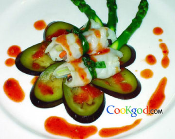 2、锅烧油至六成热,将茄子片放入油中小火炸约半分钟取出。芦笋放入开水煮熟(约20秒左右),放盐、味精调味。