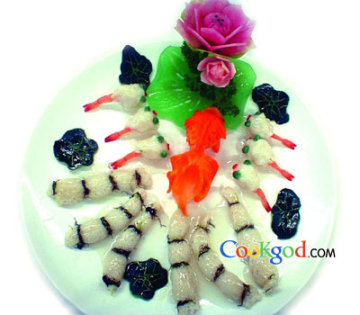 竹荪200克,海虾6只(重约200克),虾胶200克,发好的紫菜丝10克,红萝卜1个,胡萝卜100克,琼脂块100克,冬瓜皮30克,青豆20克。调料高汤100克,玉米淀粉10克,鸡汁30克,盐5克。