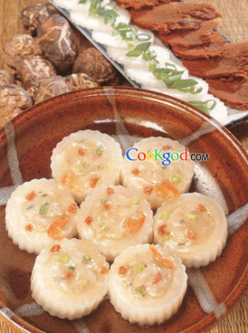 3、白萝卜去皮,横切成厚件,刮去中央部分成圆圈状,把内圈涂上薄薄生粉,酿入鱼胶,排放碟内,隔水蒸8至10分钟,滤出汁水留用。