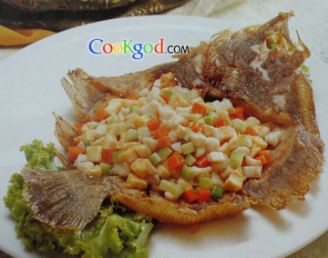 4.鱼丁加配料炒熟,倒在鱼身上即可。