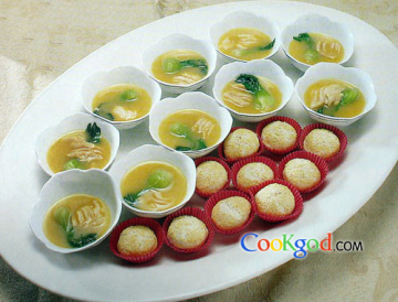 2、调好的鸡汤、藏红花下锅烧2分钟,放入鱼云、玉米浆一同烩制成熟,分装入小碗内,加入菜心、圣女果,配扬州传统酥点上桌即成。