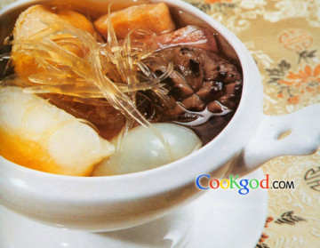 (3)花胶1件20g加15g姜汁焯水,鸽蛋煮熟去壳后放入盅内,再用精盐、味精、鸡粉调味蒸30分钟即可。