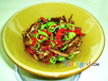 干田鱼180克(即小杂鱼)。调料青椒120克,生姜、蒜瓣、香葱各10克,豆豉5克,美极酱油10克,盐2克,白糖3克,味精5克,高汤10克,胡椒粉2克,茶油120克,老干妈辣椒酱10克。