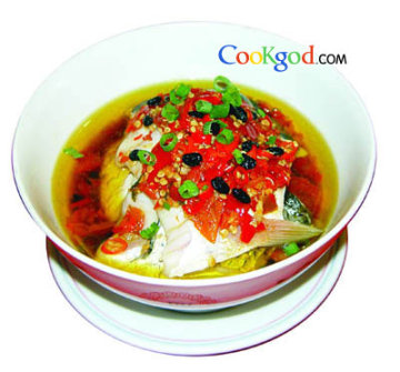 3、将腌好的鱼块取出,拣去葱段、姜片后放入碗内,放上姜米、剁椒、朝天椒、豆豉、茶油上笼旺火蒸12分钟,撒葱花即成。