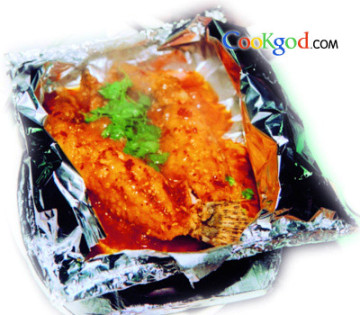 2、将腌过的鱼放入六成热油中小火慢煎至两面发硬,下入辣妹子酱、番茄酱、料酒、鸡精烧5分钟入味,淋薄芡后倒在锡纸上,淋香油、放上香菜。
