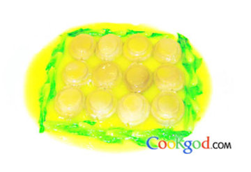 糁放模具内要压紧,鲍裙边可用牙签剥成无数皱齿,使形状更生动。
