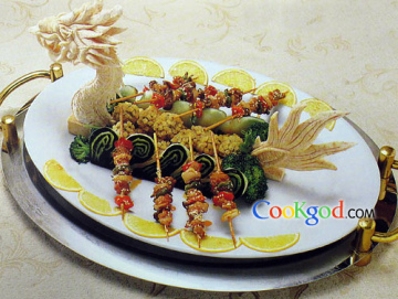 2、羊腰剞花刀,与配料穿成串,撒上调料入味,烤熟,拼摆入盘中即成。