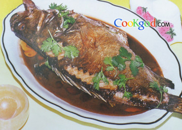 5、锅内加猪油烧热,下入鱼两面煎黄,沥去油。加入鸡汤及余下调料旺火烧开,用小火(火靠)至熟透汁浓时,去掉调料渣,出锅装盘,撒上香菜叶即成。